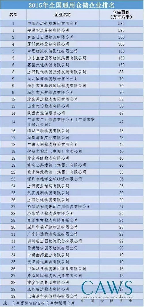 該榜單由中國(guó)倉(cāng)儲(chǔ)協(xié)會(huì)根據(jù)企業(yè)自愿申報(bào)和調(diào)查掌握的行業(yè)數(shù)據(jù),以2015年底企業(yè)自有和租用倉(cāng)庫(kù)設(shè)施的總規(guī)模為依據(jù),共排出全國(guó)倉(cāng)儲(chǔ)企業(yè)100強(qiáng),其中包括“通用倉(cāng)儲(chǔ)企業(yè)40強(qiáng)”、“倉(cāng)儲(chǔ)地產(chǎn)企業(yè)10強(qiáng)”、“冷藏倉(cāng)儲(chǔ)企業(yè)30強(qiáng)”、“危化品倉(cāng)儲(chǔ)企業(yè)10強(qiáng)”和“?;穬?chǔ)罐企業(yè)10強(qiáng)”。