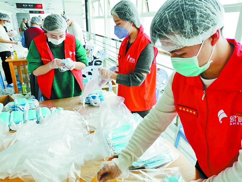 象嶼黨員志愿者協(xié)助夏商集團分裝口罩。