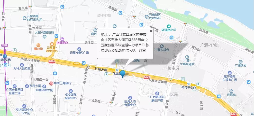 公司地址|廣西壯族自治區(qū)南寧市良慶區(qū)五象大道西段665號(hào)南寧五象新區(qū)環(huán)球金融中心項(xiàng)目T1棟總部辦公樓2601號(hào)-30、31室 |