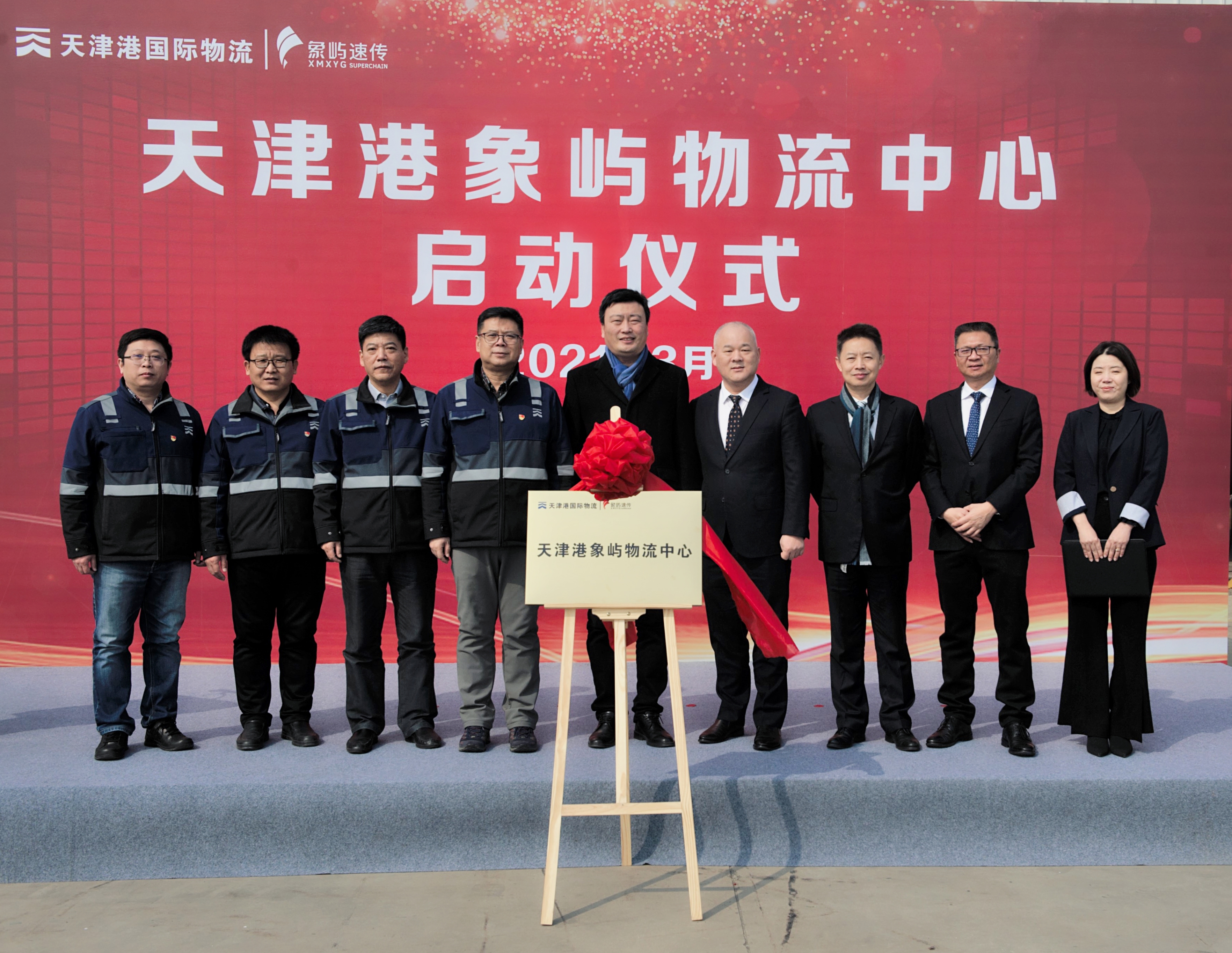天津港集團(tuán)業(yè)務(wù)經(jīng)營部物流中心主任劉鵬,天津港國際物流黨總支書記、董事長趙明,天津港國際物流黨總支副書記、總經(jīng)理趙毅,象嶼速傳總經(jīng)理孫剛,象嶼速傳副總經(jīng)理胡方等為天津港象嶼物流中心揭牌。
