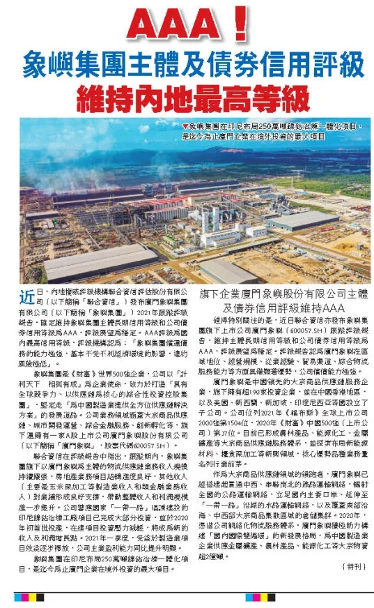 旗下企業(yè)廈門象嶼主體及債券信用評級維持AAA