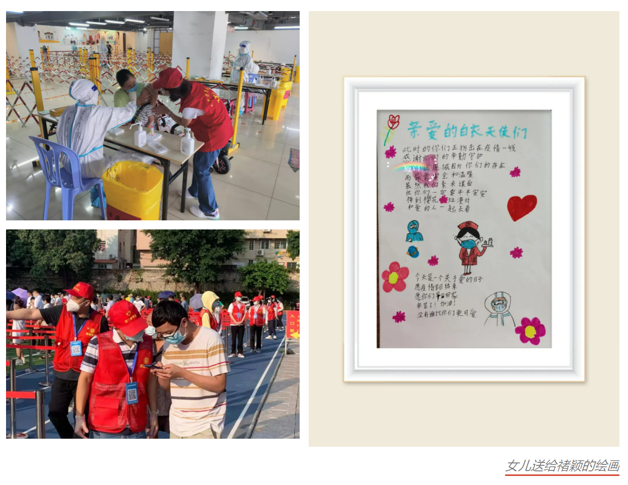 來(lái)自象嶼速傳黨辦的禇穎與她愛(ài)人更是雙方齊上陣,兩人錯(cuò)開(kāi)時(shí)間進(jìn)行志愿服務(wù),一人在外幫助市民進(jìn)行核酸檢測(cè),一人在家照顧孩子,既顧好“小家”也顧著“大家”。當(dāng)她完成志愿者任務(wù),給女兒看了自己的照片后,女兒忽閃忽閃的大眼睛直直地看著媽媽說(shuō):“媽媽,真不容易,應(yīng)該很熱吧!”夫妻二人用親身經(jīng)歷給孩子樹(shù)立了一個(gè)好榜樣!