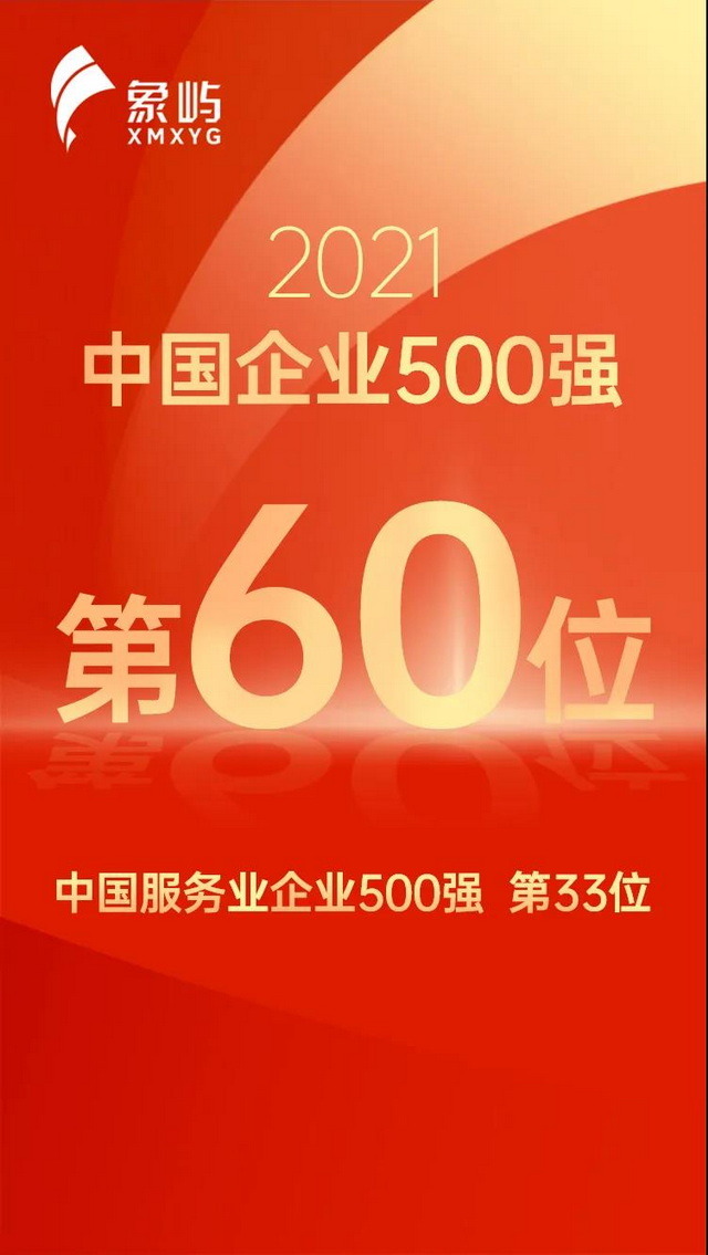 9月25日,中國(guó)企業(yè)聯(lián)合會(huì)、中國(guó)企業(yè)家協(xié)會(huì)發(fā)布2021年中國(guó)企業(yè)500強(qiáng)榜單,象嶼集團(tuán)以37483544萬(wàn)元人民幣的營(yíng)收排名第60位,較去年前進(jìn)17位;在同期發(fā)布的“2021年中國(guó)服務(wù)業(yè)企業(yè)500強(qiáng)”中,象嶼集團(tuán)位列第33位,較去年前進(jìn)10位。自2007年參評(píng)榜單以來(lái),象嶼集團(tuán)已連續(xù)15年登榜,排名年年躍升。