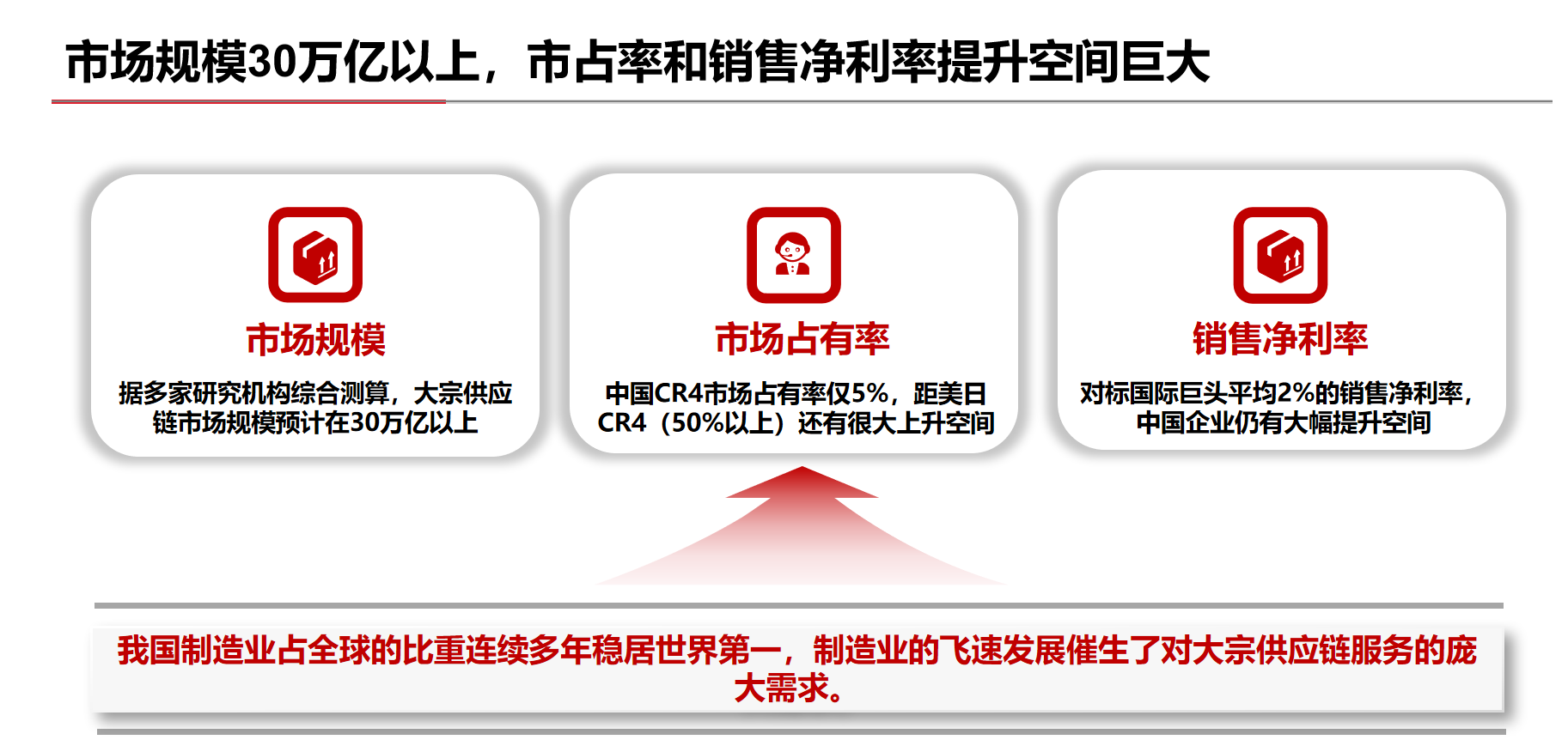 制造業(yè)企業(yè)日益專業(yè)化,對供應鏈服務的需求從簡單追求成本,轉變?yōu)楦非笮剩袌鲐叫枘?span style="color: rgb(239, 25, 25); box-sizing: border-box;">提供“一攬子”服務、具備效率優(yōu)勢的大宗供應鏈服務商。