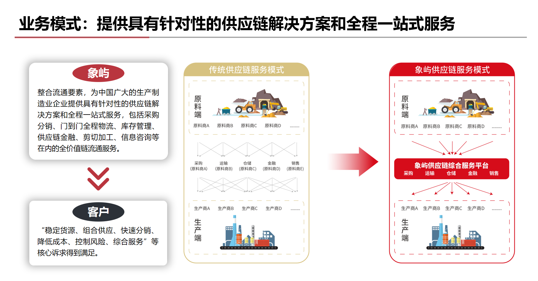 豐富多元、成熟穩(wěn)定的全球化業(yè)務渠道體系;覆蓋全國、連接海外的網絡化物流服務體系;正在構建、初步成型的智能化信息科技體系;準確識別、日趨完善的全面風險管控體系;市場化、專業(yè)化的供應鏈服務團隊。